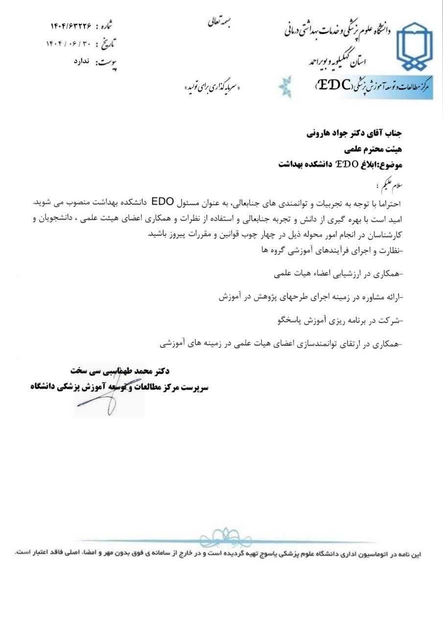 طی حکمی از سوی دکتر محمد طهماسبی سی سخت،سرپرست مرکز مطالعات و توسعه آموزش پزشکی دانشگاه ،دکتر جواد هارونی عضو هیئت علمی دانشگاه به عنوان مسئول EDOدانشکده بهداشت و علوم تغذیه منصوب گردید.
